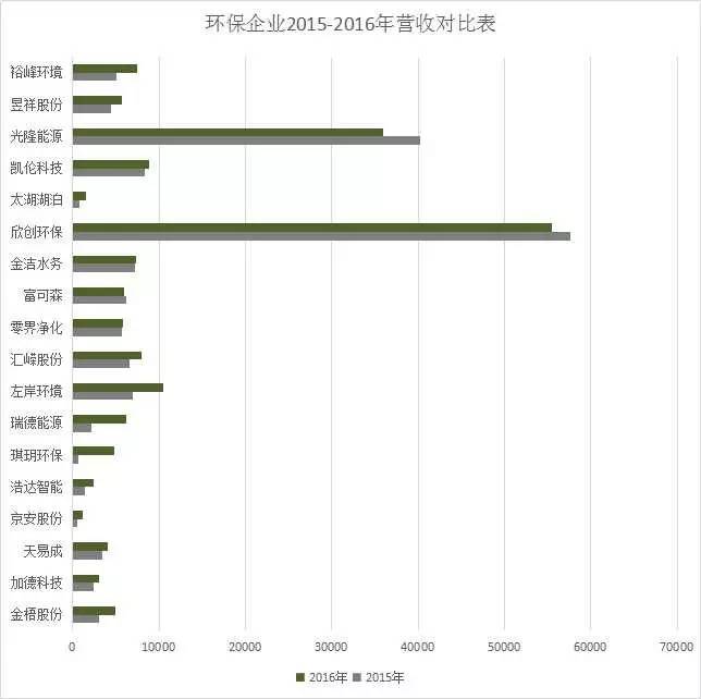 通过2015-2016年营收对比表可以看出,营收最多的当属国有企业欣创环保,不过其2016营收比2015年的还少,同比下降了2.78%。与之情况类似的还有营收排行第二光隆能源以及营收平平的富可森。营收同比增长较多的有左岸环境、琪玥环保、瑞德能源,整体增长率不高。